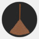 This sheet of round stickers features an image of an old-fashioned Besom, or witches broom. The besom is brown and is covered in lots of little twigs. The background is black.