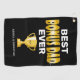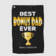 Modern golfing towel for stepdads this fathers day, or birthday, with text that reads 'BEST BONUS DAD EVER' in gold and black, personalised with your stepdads initials and kids names (can be also left blank).
