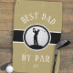 Best Dad By Par golf quote design in trendy white font features a male golfer silhouette set on a realistic golf ball image. The golf ball is placed on a black circle outlined in white complemented by a matching black band also outlined in white. The background is gold colour. Personalise with template to add custom monogrammed initials or short line of text. If you have any questions regarding this or any of my designs please contact beachpausedesigns@gmail.com. Makes a perfect Father's Day or Birthday surprise for Dad! Custom requests accepted.