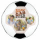 Best Dad Ever 3 photo soccer ball - lovely keepsake gift for dad for father's day etc. The design is lettered in groovy retro typography and the template is set up for you to add three of your favourite photos. Your pictures are displayed in round format and if you have any trouble with placement, try cropping your photo to a square before uploading. Click customise further to edit using the design tool if you wish to change any of the colours.