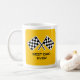 A custom photo coffee mug for racing fans and lovers of speed! This editable template features "Best Dad Ever" and winning chequered flags — easily personalise it for Mum, Sister, Brother, Aunt, Uncle, Grandma, or Grandpa! A perfect gift for birthdays, holidays, Father's Day, Mother's Day, or sports vehicle enthusiasts! Printed colours: yellow, black and white.