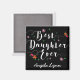 Beautiful modern script calligraphy in white with words, "Best Daughter Ever." Design is centred in colourful floral and greenery accents on black background. Placeholder for your daughter's custom name in bottom centre of design.