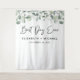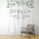 Elegant wedding photo booth backdrop tapestry featuring sage green watercolor eucalyptus greenery, "Best Day Ever" in a stylish modern script, your first names and the date.