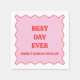 Celebrate your special day in style with these customisable "Best Day Ever" wedding napkins, featuring a whimsical pink background and vibrant red text. The trendy scalloped edge adds a playful yet elegant touch, perfect for modern weddings, bridal showers, or rehearsal dinners. Easily personalise with your names and date for a personal touch that guests will love. The bold font and cheerful colour palette make this napkin a standout detail for your table settings, enhancing your event's overall aesthetic. Ideal for those looking to blend classic romance with a contemporary twist, these napkins bring chic charm to any celebration.