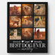 Personalised pet photo plaque featuring a trendy black background that can be changed to any colour, a 9 picture collage of your dog, character words that represent your animal, the saying "best dog ever", and their name.