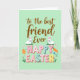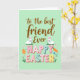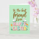 Designed with a soft pastel green background, this card features friendly spring artwork that feels warm and close. Near the top, warm brown flowing lettering reads “to the best friend Ever,” with the words centered and spaced to breathe. On either side of “Ever,” two white long-eared animals with pink inner ears and small blue neckbands face inward, their gentle poses suggesting an easy bond 🐰. Below, “HAPPY EASTER” sits in large stacked letters, filled with soft pink, sky blue, and pale yellow, each letter decorated with dots and stripes for extra texture. Small floral sprigs in light pinks and blues tuck around the message, adding a garden feel 🌷. A speckled orange egg and an orange root vegetable sit among the flowers, balancing the layout with cozy seasonal details. The overall design keeps the text readable while letting the characters’ tender, friendly look draw your eye. The bottom area shows the patterned “HAPPY EASTER” letters above the scattered flowers, the speckled egg, and the orange root vegetable.