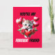 An adorable kitten with big eyes is resting its paws and head on a large red heart that has a red rose flower on each side of it and red heart balloons set against a watermelon pink background which has the cat pun "you're my furever friend" on it in black and white. The inside is blank for your custom message. This versatile and cute design is ideal for cat lover bff's whether it be a man, woman, boy or girl. They are ideal for Valentine's Day holidays; on your friends birthday, anniversary, engagement or just because you want to show them how much you care about them,