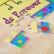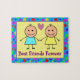 Cute colourful puzzle of two best friends forever. The main focus are two girls one in a blue dress and one in a yellow dress. In between them is a cute pink love heart. They are inside a yellow rectangle framed with a multicolored polka dot frame.