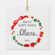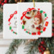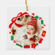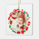 Celebrate your little one's first Christmas with this enchanting photo ornament, featuring a delightful image of your baby nestled within a vibrant red and green wreath. Adorned with charming presents, a festive ribbon bow, and holly accents, this keepsake captures the magic of the season while creating a lasting memory. Perfect for hanging on the tree or displaying on a mantel, this ornament is a heartwarming addition to your holiday decor and a treasured gift for years to come.