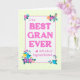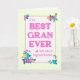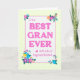 A pretty Mother's Day card for the BEST GRAN EVER. The design has a yellow check gingham border surrounding the words, 'To the BEST GRAN EVER with Lots of Hugs and Kisses', in magenta pink lettering on a lightly textured white background. There are bright clusters of multi-coloured flowers in the corners and a small magenta pink heart. The inside message can be customized or deleted if you wish.
