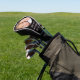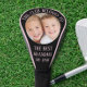 A black golf club head cover for a golfer grandmother that features "This Club Belongs to the Best Grandma By Par" in light pink lettering and a photo of her grandchildren.