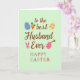 This design shows a pale mint-green background with the main message, “to the best Husband Ever,” centered in smooth, flowing brown lettering that feels like a gentle note between close partners. Small, simplified spring icons gather around the words, adding a cozy, affectionate mood without crowding the space. In the upper left, a pair of orange root vegetables with leafy green tops sits near a blue egg decorated with tiny white dots, like little gifts tucked beside a love note. Across from it, a yellow egg with pink zigzag lines brings a bright contrast that keeps the layout lively, with a hint of flirty energy. Lower on the card, a pink bunny head 🐰 with upright ears and a sweet, friendly expression appears near a pink egg covered in white dots and another orange root vegetable, creating a warm, companionable cluster. Near the bottom, “HAPPY EASTER” is placed in alternating soft blue, orange, and pink letters, lined up neatly beneath the illustrations, with a small 🌷 touch that fits the spring theme. The blue egg’s white polka dots are evenly spaced, and the yellow egg’s pink zigzags run diagonally in tidy rows.