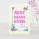 A pretty Mother's Day card for the BEST MAM EVER. The design has a yellow check gingham border surrounding the words, 'To the BEST MAM EVER from Bothl of Us, in magenta pink lettering on a lightly textured white background. There are bright clusters of multi-coloured flowers in the corners and a small magenta pink heart. The inside message can be customised or deleted if you wish.