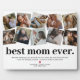 Modern mothers day plaque featuring a photo collage of 12 family pictures for you to replace with your own, the saying "best mom ever.", a personalized thank you note, a cute red heart, and your childrens names.