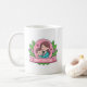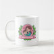 Adorable mug ideal for Mother's Day. A cute illustration of a mother and her child giving each other a loving hug. Both are wearing a blue shirt and have brown hair. Both have a loving smile and rosy cheeks. They are set inside a pink circle with sparkles and two love hearts dotted around. Below them is a pink banner with an elegant script reading 'Best Mum Ever', this is a template that can be used as it is or replace the original text with your own to personalise. Surrounding the circle and banner are green leaves and pink flowers. A pretty drawing ideal for your mum.