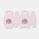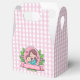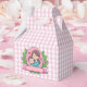 Adorable favour box ideal for Mother's Day. A cute illustration of a mother and her child giving each other a loving hug. Both are wearing a blue shirt and have brown hair. Both have a loving smile and rosy cheeks. They are set inside a pink circle with sparkles and two love hearts dotted around. Below them is a pink banner with an elegant script reading 'Best Mum Ever', this is a template that can be used as it is or replace the original text with your own to personalise. Surrounding the circle and banner are green leaves and pink flowers. A pretty drawing ideal for your mum. The background is a pink and white gingham.