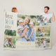Custom photo blanket which you can personalise with 5 of your favourite pictures. The design has a modern colour palette of stone, brown, blue and yellow and is lettered with casual script and skinny font typography. The wording reads "best mum ever" and the template is set up ready for you to add your name(s), the occasion (such as mother's day, birthday etc) and the year. Upload your photos, working from left to right, which will be displayed in a mix of portrait and landscape formats. Please browse my store for alternative styles and colours.