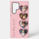 Design your own phone case with this pretty pink photo template Galaxy S22 phone case with space to add 4 custom photos. Upload your favourite pictures and customise the name with your personalisation. A great gift for Mum when you add your own photos of the kids. Features a soft pink cover with glitter heart backgrounds on the heart photo templates.