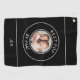 Creating your own golf towel is easy with our user-friendly template. All you need to do is upload your best photo and enter your initials, name, or any text you want. You can also customise the colours of the text and the background to match your pop's style. The photo and the text are printed in white with two circular white borders, creating a striking contrast with the classic black background.