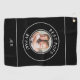 Creating your own personalised golf towel is super easy with our online template. All you need to do is upload your favourite family photo and type in a monogram, name, or any text you want. You can also choose the colours of the text and the background to match your pop's style. The photo and the text are printed in white with two circular white borders, which contrast with the solid black background.
