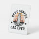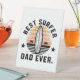 A gift for your surfer dad with this retro sunset design of a vintage surfboard in a tropical minimalist scene that says, "Best Surfer Dad Ever"