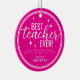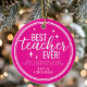 Best Teacher Ever Pink Script Retro Ceramic Ornament. Celebrate your amazing teacher with this heartfelt 'Best Teacher Ever' ornament! This vibrant pink, text-based design features elegant white script proclaiming gratitude and appreciation. It also includes a space for a personalized message, and space for the student's name, making it a truly special keepsake. This ornament is a perfect way to show your teacher how much they mean to you and acknowledge their dedication to helping students flourish. It's an ideal holiday or Christmas gift to commemorate their impact.