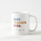 A stylish teacher gift mug with bold retro-modern typography spelling out “BEST. TEACHER. EVER.” in muted tones of dusty blue, warm ochre, and deep brick red. Beneath the text, three minimalist sketch-style icons — a lightning bolt, an open book, and a coffee cup — add subtle charm without clutter. Clean, balanced, and trendy, this mug feels like it came straight from a modern indie stationery brand.