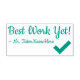 This motivating rubber stamp design features the motivational feedback message "Best Work Yet!" and a custom teacher's or educator's name. It also features a decorative checkmark icon. It could be used by a teacher, educator, or tutor when grading student work, to acknowledge that a student has done an exceptional job.