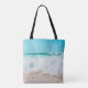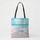 Custom Printed Personalised Girls Beach Trip Vacation Tote Bag with "Drink in Hand, Toes in Sand" editable quote, name, your destination, and trip information with a sandy beach waves background image.