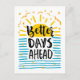 Encourage someone going through rough times with this cheery hand-lettering style typography design featuring the message in black, brush script letters, "Better Days Ahead" surrounded by watercolor sun with rays and stars and light blue ocean waves.