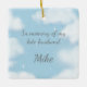 This morbidly funny ornament has a scene of heavenly blue sky, dreamy clouds, sparking stars and the words "In Memory of my late husband [insert name]." The back of the ornament gives yoh a surprise with the words "Better late than never!" You have the option of inserting a custom photo of your spouse (or fantasy spouse) looking down on you from heaven.
