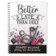 Fun self-ironic notebook for makeup lovers, featuring the caption "Better late than ugly", in black modern typography, decorated with a beautiful illustration of cosmetic products.
