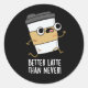 Better Latte Than Never Funny Coffee Pun features a cute latte coffee running. Perfect pun gift for family and friends who love cute coffee latte puns.