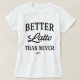 This Better Latte Than Never shirt is meant for a fashionable lady who is always fashionably late, and likes to have fun with it.
