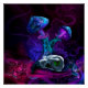 Vibrant, surreal dreamworld with mushrooms, bird skull, and lots of depth and dimension that leaves the viewer with the desire to explore different realms and dimensions.