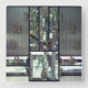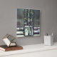 A modern, masculine design featuring birch trees seen through beveled glass on a metallic, silver pinstripe background. Elegant and masculine stained glass look. In colors of silver and black.