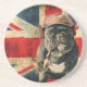 This coaster has the British flag and a French Bulldog design .