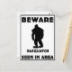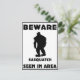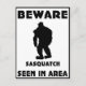 Black & white beware sign, warning trespassers that a Sasquatch has been seen in this area. Phrase states, “Beware” on the top of the poster in large black font with a black sasquatch silhouette in the centre & words, “Seen In Area,” written at the bottom of the sign.