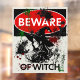 Fun sign "Beware of Witch" with a witch, blood, and green and black matter splatters.