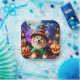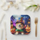 A fluffy, smiling dog dressed in an adorable witch costume steals the show in this Halloween scene. Sporting a pointy hat and a pumpkin-themed outfit, the pup sits proudly amidst carved pumpkins, flickering candles, and spooky houses silhouetted against a full moon.