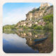 Coaster with the castle and the village of Beynac-et-Cazenac built upon the cliffs alongside Dordogne river in the early morning with reflection in the river and a kayak in the foreground. The town is situated in the Perigord in France.