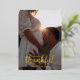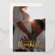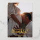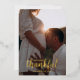 Thanksgiving pregnancy announcement card with real gold foil and the saying "beyond thankful". Personalize it with your own photo, a message on the back, the family name, and the current year.
