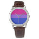 Make a bold statement with this stunning Bisexual Pride Flag watch featuring a classic brown leather strap. The rich pink, purple, and blue stripes of the bi flag are beautifully displayed on the watch face, offering a harmonious contrast to the warm tones of the brown leather. This stylish timepiece seamlessly blends classic design with modern pride, perfect for everyday wear or special occasions. Celebrate your identity or show support for the bisexual community with this timeless accessory that speaks volumes without saying a word.