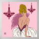 Our beautiful Bianca with blonde hair, dressed in white and rose. Bianca is adorned with jewels and holds a dusty rose feathered fan. Burgundy chandeliers on a light pink background.