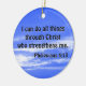 Inspirational Bible verse ornament for Christians- One of the most popular Bible passages, "I can do all things through Christ who strengthens me" -Philippians 4:13, is written in black letters with a 3D white shadow look against a photo of a bright blue cloudy sky. Unique spiritual ornament of faith affirmation for many occasions, including birthday and graduation gifts. Great motivational gift for ministers and anyone dealing with difficult times or sorrow. Change the letter size, colour, or style if desired, or add your own favourite Biblical passage or any text you wish. Nice gift for Christians, not just during the holiday season.