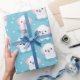 The image is a cute pattern featuring smiling Bichon Frise puppies on a blue background with playful bone and paw print accents.