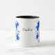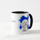 A beautiful water colour portrait of an adorable white Bichon Frise stands out against a bright blue abstract paint splatter background. The image is on two sides of the mug, with your name or other custom text in black between them.