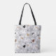 Cute bichon frise dogs in sweaters and bows with scattered dog bones and paw prints on a light grey background.
