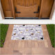 Cute bichon frise dogs in sweaters and bows with scattered dog bones and paw prints on a light purple background.