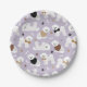 Cute bichon frise dogs in sweaters and bows with scattered dog bones and paw prints on a light purple background.